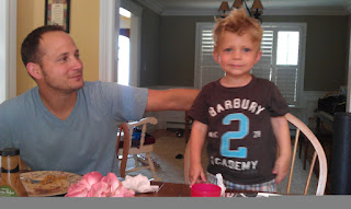 #3 Its the great invention called JOGGING STROLLER. Now it ain't easy pushing a 42lb year old and a 28lb pound ( I think he is 28lbs) 3 year old...but its doable and if you have no other option you do it. I've been finding that I actually enjoy this option a lot and so do the kids. It is really nice in the evening because it calms the kids down after a long day and it sometimes even puts them to sleep!!! I mean if thats not a bonus I don't know what is. I will often choose this option if its a 3-5 miler. Anything beyond that I lose them and I'm hurting from pushing that and trying to keep a somewhat decent pace. I also usually recruit Scott as a partner on these runs and we do 1/2 mile on 1/2 mile off with trading the stroller. It's definitely a harder and more intense workout.